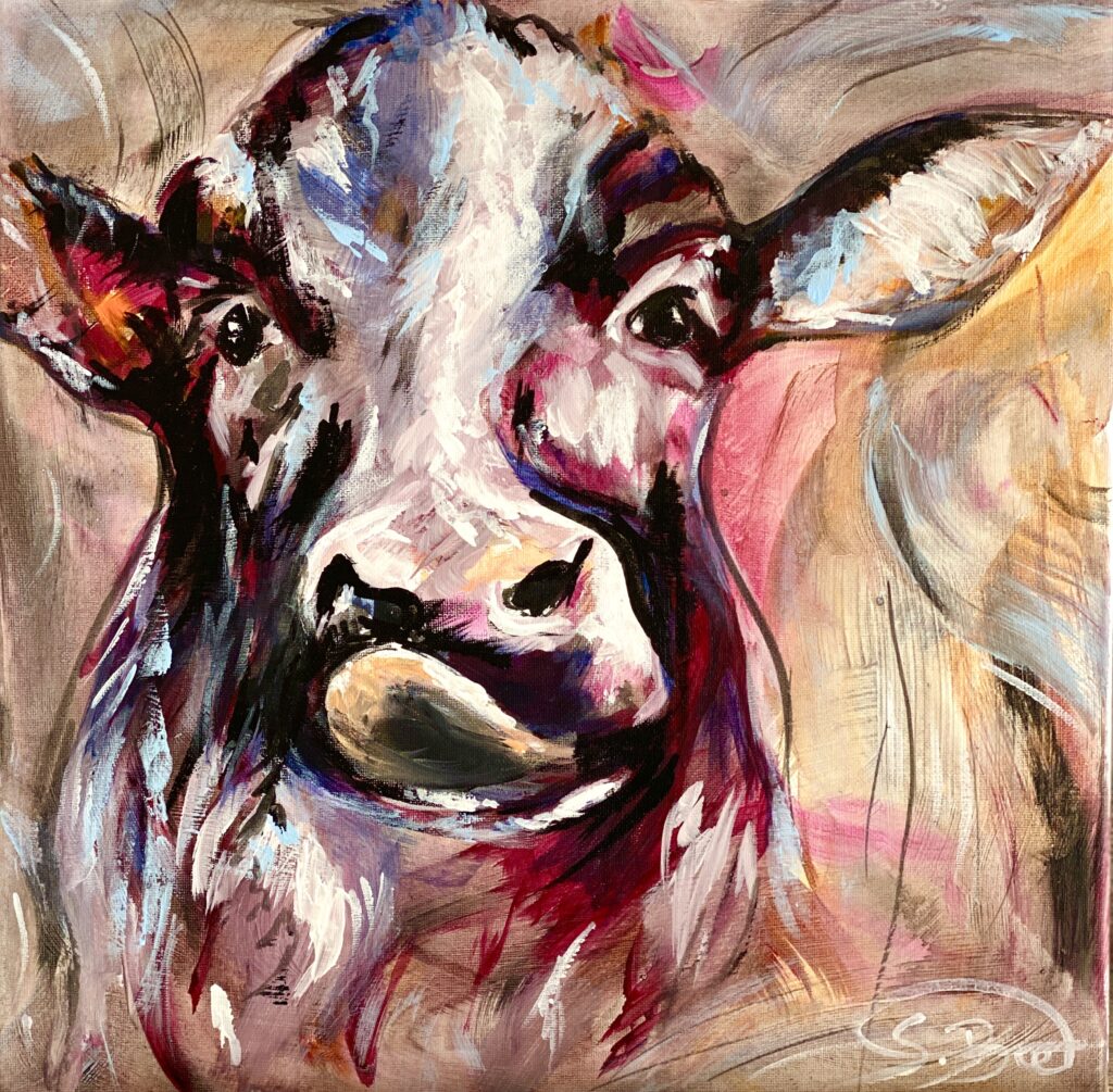 Das Bild zeigt ein ausdrucksstarkes Porträt einer Kuh in lebendigen, kontrastreichen Farben. Der expressive Pinselstrich und die ungewöhnliche Farbpalette – mit kräftigen Rottönen, Violett, Blau und Weiß – verleihen dem Tier eine emotionale Tiefe und fast menschliche Präsenz. Der Hintergrund ist abstrakt gehalten und unterstreicht mit dynamischen Farbwirbeln die Energie des Gemäldes. Die Perspektive ist frontal und schafft eine unmittelbare Verbindung zwischen Tier und Betrachter.